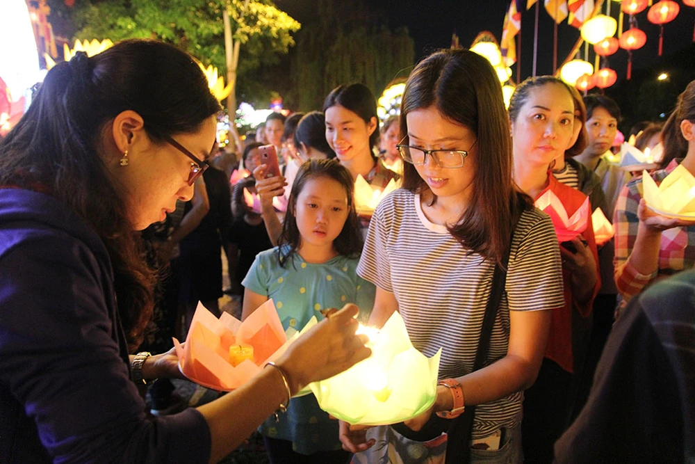 Tối 9-5, chùa tổ chức thả hoa đăng. Đây là một trong những hoạt động chào mừng Phật Đản của chùa Pháp Hoa.