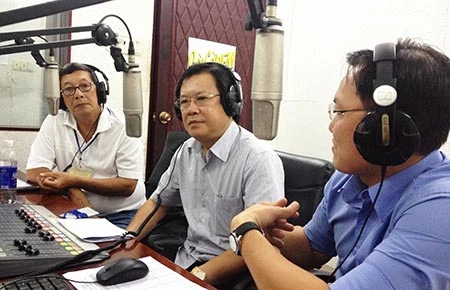 Từ trái sang: Các nhà báo Hồ Nguyễn, Mai Ngọc Phước và Huỳnh Sang đang thực hiện chương trình “Chào buổi sáng” nói về “hiệp 2” của trận đấu với Minh Hùng. Ảnh: TT