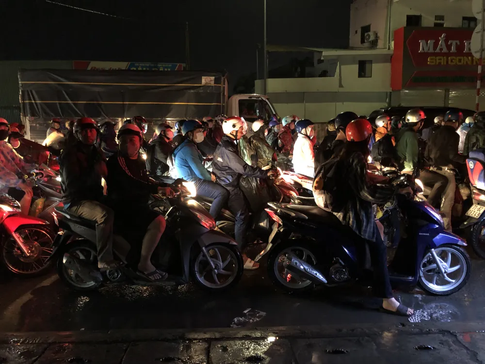 Càng về tối, lượng xe lưu thông trên tuyến quốc lộ 1 càng tăng dần lên. Trên nhiều xe có trẻ em, ai nấy đều tỏ ra mệt mỏi với hành trình kéo dài và bị mắc mưa.