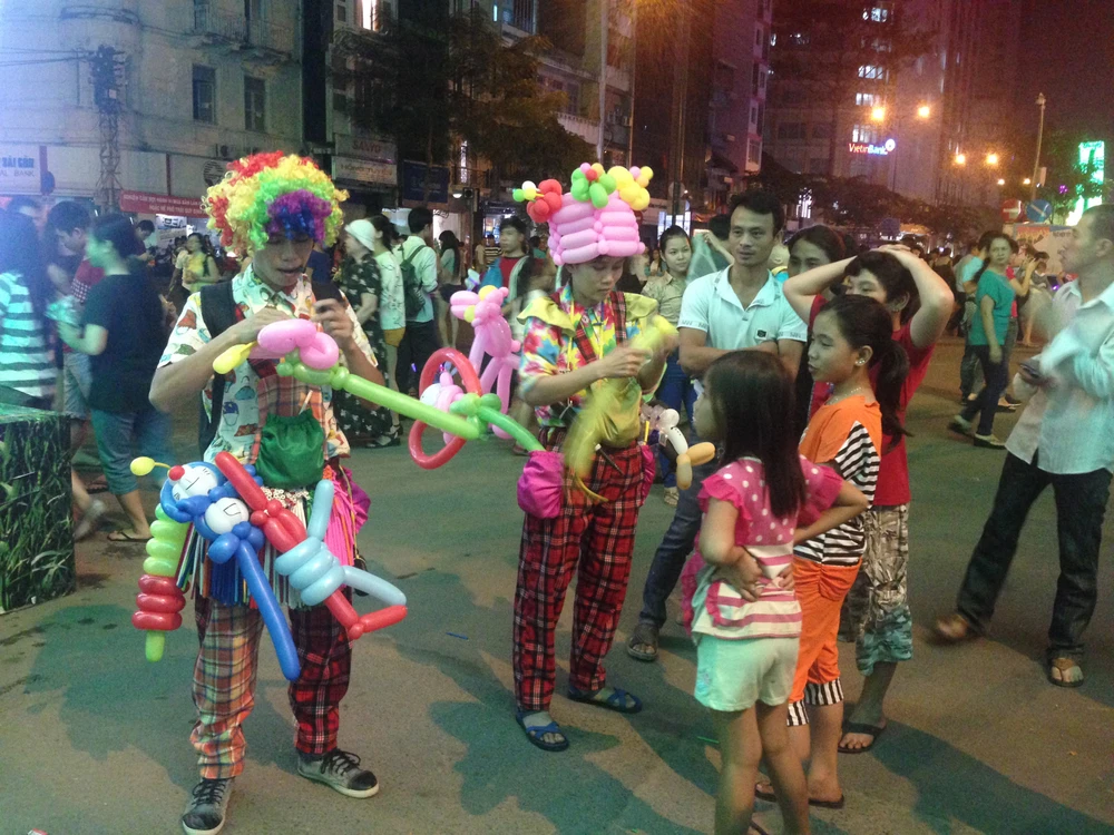 Những chiếc bong bóng với đủ màu sắc đủ hình thù được người bán "trang trí" lên người để thu hút người mua.