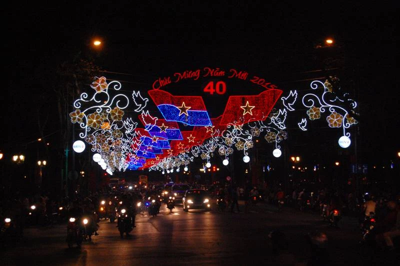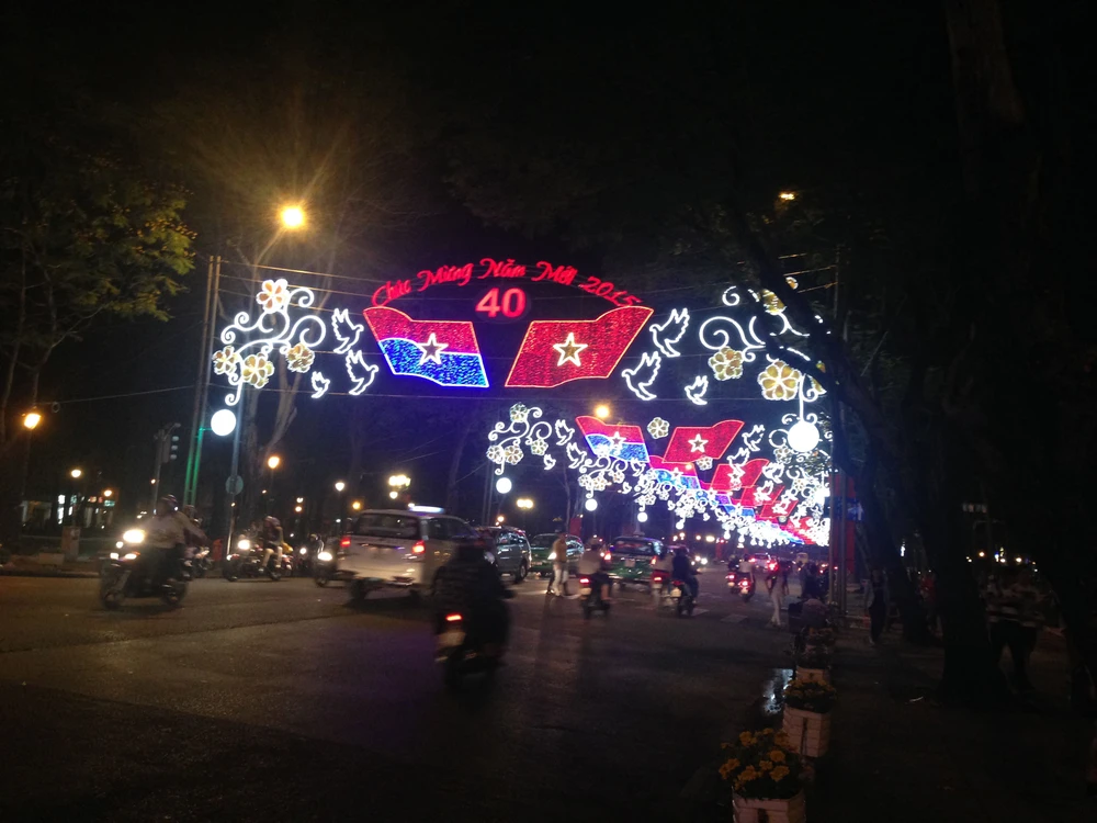 Đường Lê Duẩn được trang trí đèn hoa rực rỡ mừng năm mới và kỷ niệm 40 năm ngày Giải phóng miền Nam thống nhất đất nước.