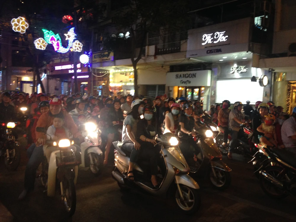 Đường Hàm Nghi đã được chặn lại và không cho xe vào con đường này. Nhưng hiện tại đường đi bộ này đã tập trung rất đông người ngồi chờ xem bắn pháo hoa. Dọc bờ sông Sài Gòn đoạn qua đường Tôn Đức Thắng hiện tại cũng tập trung rất đông người dân chờ xem pháo hoa.
