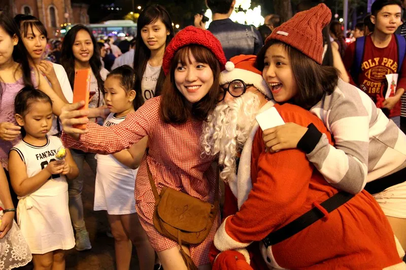 Nhóm bạn trẻ tìm góc chụp ảnh giữa dòng người đi chơi Noel. Ảnh: HOÀNG GIANG