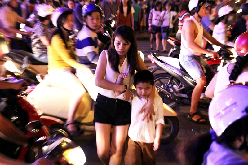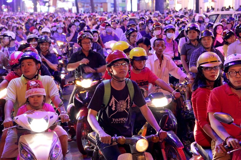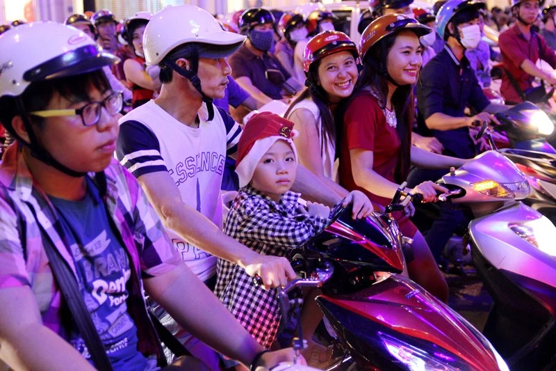 Mặc dù kẹt đường nhưng ai nấy đều vui vẻ trong đêm Noel. Ảnh: HOÀNG GIANG