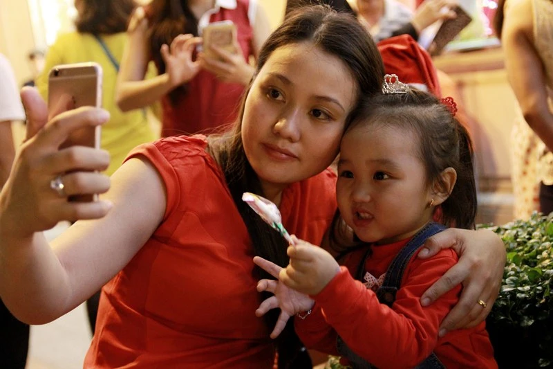 Mẹ con cùng đón Giáng sinh tại Trung tâm thương mại Diamond Plaza. Ảnh: HOÀNG GIANG