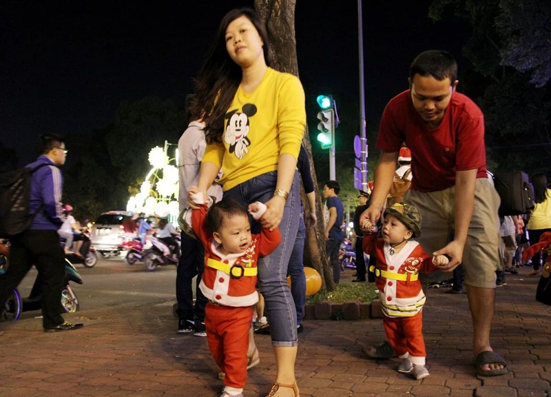 Những ông già Noel nhí đang tập đi được cha mẹ đưa xuống phố. Ảnh: HOÀNG GIANG
