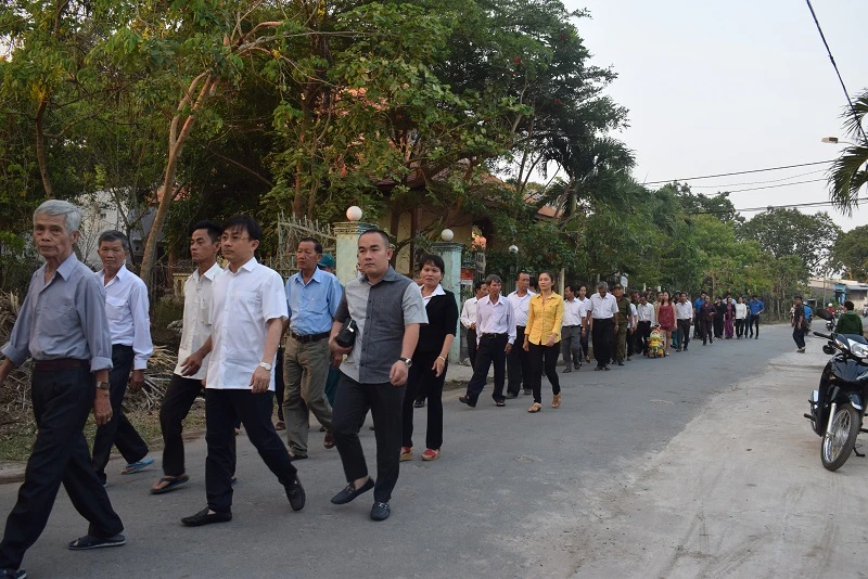 Đoàn xã Tân Hòa Đông đã đi viếng bác Khải từ hôm qua nhưng chiều nay vẫn đến để đưa tiễn bác về hội trường Thống Nhất.