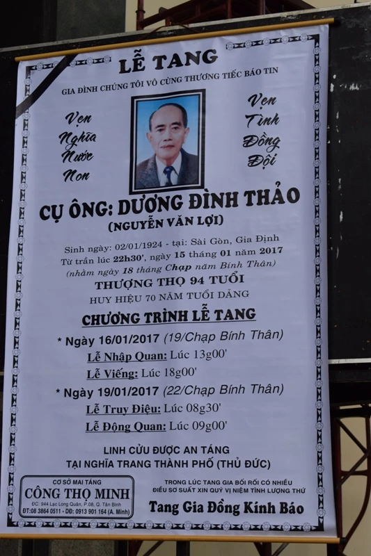 Lễ truy điệu ông Dương Đình Thảo sẽ bắt đầu vào 8h30 phút ngày 19-1. Linh cữu của ông sẽ được an táng tại nghĩa trang thành phố (Thủ Đức).