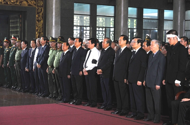 Các lãnh đạo, nguyên lãnh đạo Đảng, Nhà nước và TP.HCM dự lễ truy điệu nhà tình báo Trần Quốc Hương. Ảnh: Nguyệt Nhi