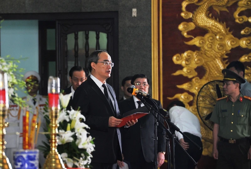 Bí thư Thành ủy TP.HCM Nguyễn Thiện Nhân đọc điếu văn. Ảnh: Nguyệt Nhi