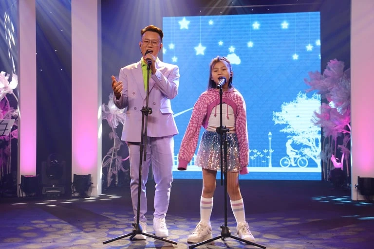 Hai cha con ca sĩ Hoàng Bách tập chương trình "Quà tặng Giáng sinh 2021– Hoan ca tình yêu". Ảnh: BTC cung cấp