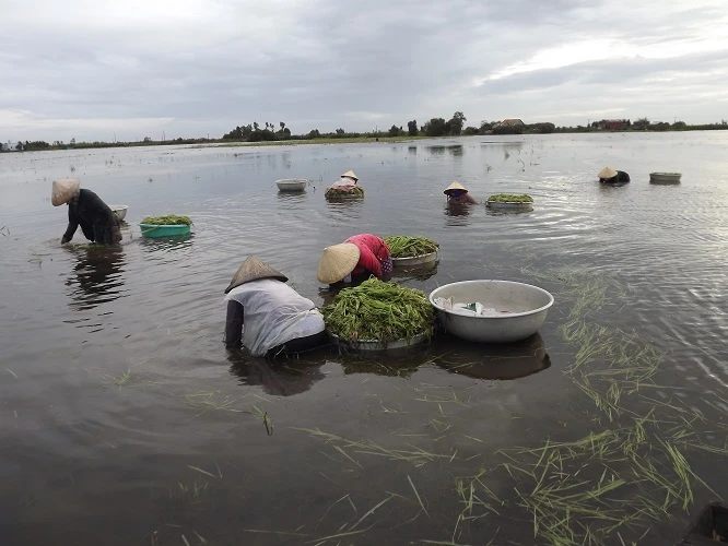 Tờ mờ sáng, cánh đồng hẹ nước ở Tân Lập, Mộc Hóa (Long An) đã lác đác người đi nhổ. Những cơn mưa lâm râm ảnh hưởng từ cơn bão đêm qua không ngăn được công việc của những người phụ nữ trung niên, họ mặc thêm áo mưa chế từ bao nilon cũ đựng phân bón để chống lại cái lạnh khi trầm mình cả ngày trong nước lũ.