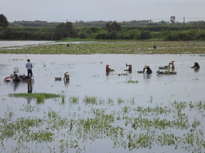 Vậy mà bây giờ, đi dọc hết con kênh 79, từ Mộc Hóa đến Tân Hưng với 2 bên là những cánh đồng nước nhìn mút tầm mắt, họa may lắm mới có một vài cánh đồng hẹ, bông súng lưa thưa. Người ta bảo do nhiều năm liền lũ nhỏ, cộng với sự lạm dụng phân thuốc hóa học nên bây giờ những cánh đồng hẹ, bông súng được ví von là “lộc trời”, không phải ruộng nào cũng có.