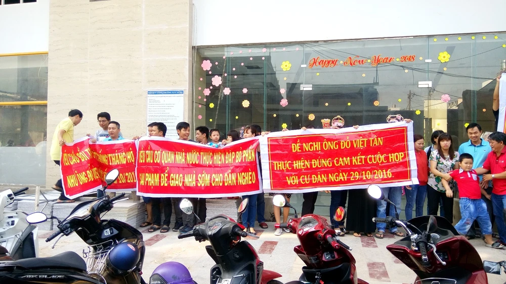 Nhiều khách hàng cho biết đã gọi cho chủ đầu tư biết ngày hôm nay (11-3) sẽ đến dự án căng băng rôn yêu cầu giao nhà nhưng rốt cuộc không có ai đến. Theo quan sát của chúng tôi, các khách hàng căng băng rôn hô các nội dung “ Yêu cầu cơ quan nhà nước đập bỏ phần phần sai phạm của dự án để sớm giao nhà cho dân nghèo”, “Đề nghị ông Đỗ Việt Tân, Tổng giám đốc Công ty TNHH Đầu tư Bất động sản Tân Bình giao nhà đúng cam cết”…