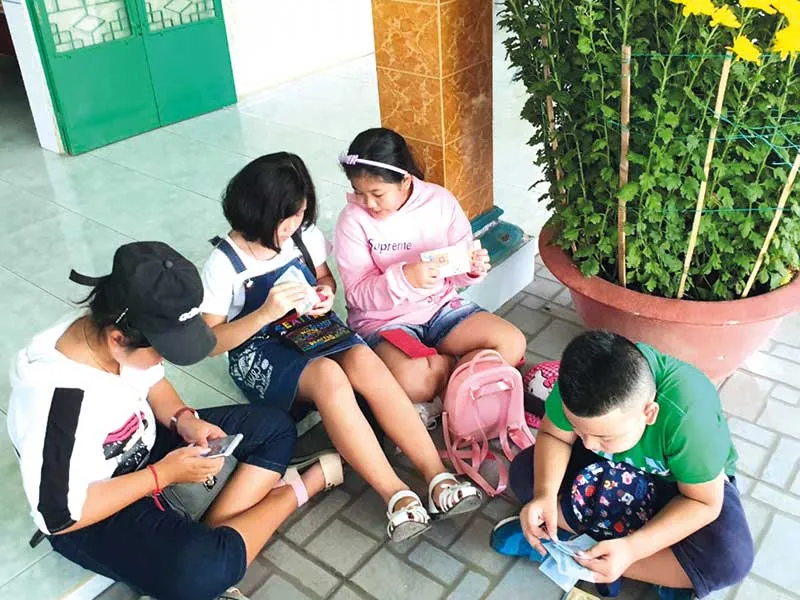 Trong lúc anh chị em bà Bảy hàn huyên tâm sự thì đám cháu con rủ nhau chơi đùa, cười nói. Sân nhà cậu Út khá rộng nhưng dường như không đủ chỗ cho mấy đứa nhỏ chạy nhảy. Chỗ này đám con gái nhảy lò cò, chơi banh đũa; chỗ kia tụi con trai chơi tạt lon hoặc chơi trò trốn tìm. Những đứa lớn hơn thì tụ năm tụ ba nói chuyện học hành, thi cử…