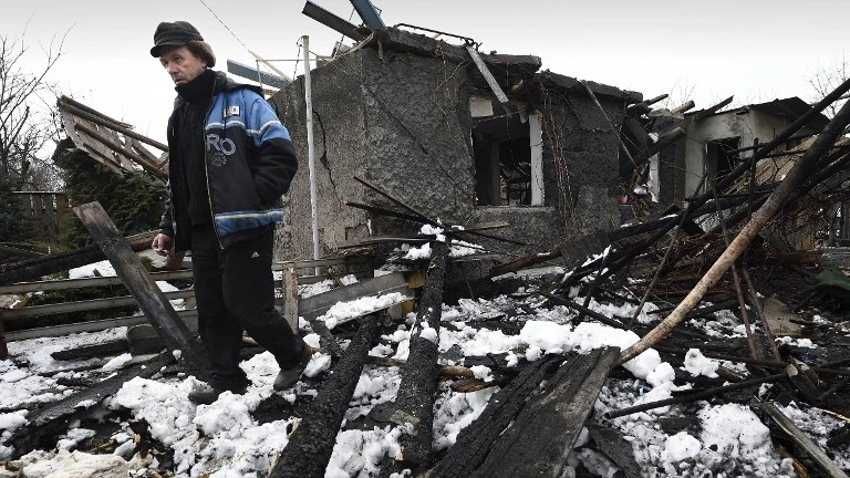 Một người đàn ông trước ngôi nhà bị tàn phá do chiến tranh tại Donetsk