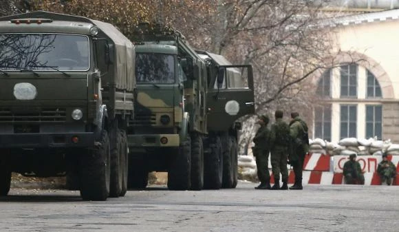 Dân quân và xe tải ở một trạm gác gần một tòa nhà ở Donetsk, Đông Ukraine