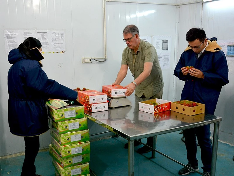 Nhân viên kiểm dịch thực vật của Mỹ đang kiểm tra trái cây trước khi xuất khẩu tại một công ty Việt Nam. Ảnh: QUANG HUY