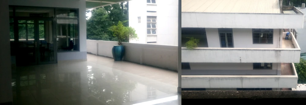 Thật may mắn, các phòng máy và khu vực hành lang ở đây nay đã được ‘giải phóng’ trông thật rộng rãi, thoáng đãng. Năm 2012, khu vực này bị rào khóa kín, cấm xâm nhập. Ngày trước, không dễ để có được không gian thông thoáng tuyệt vời với hai cây xanh thơ mộng như vầy. Ảnh: HỒ TRANG