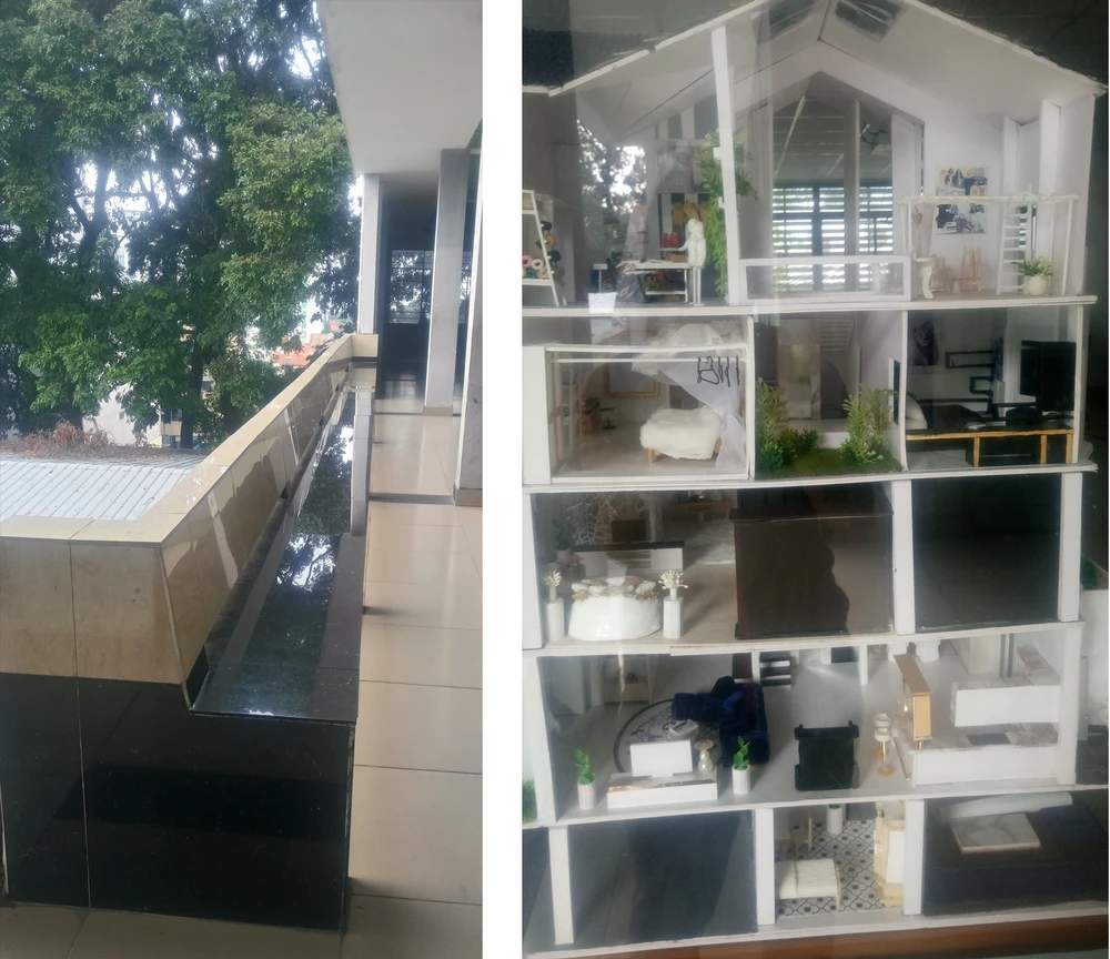 Ảnh trái: Hàng ghế xi măng trước phòng học nay đã được ốp gạch trông thật mát mẻ, sạch sẽ, chẳng bù cho màu xám xịt, loang lổ màu vẽ, đầy vết bong tróc ngày nào. Ảnh phải: Màu xanh mát lành xuất hiện cả trong bài đồ án mô hình của một bạn sinh viên. Ảnh: HỒ TRANG
