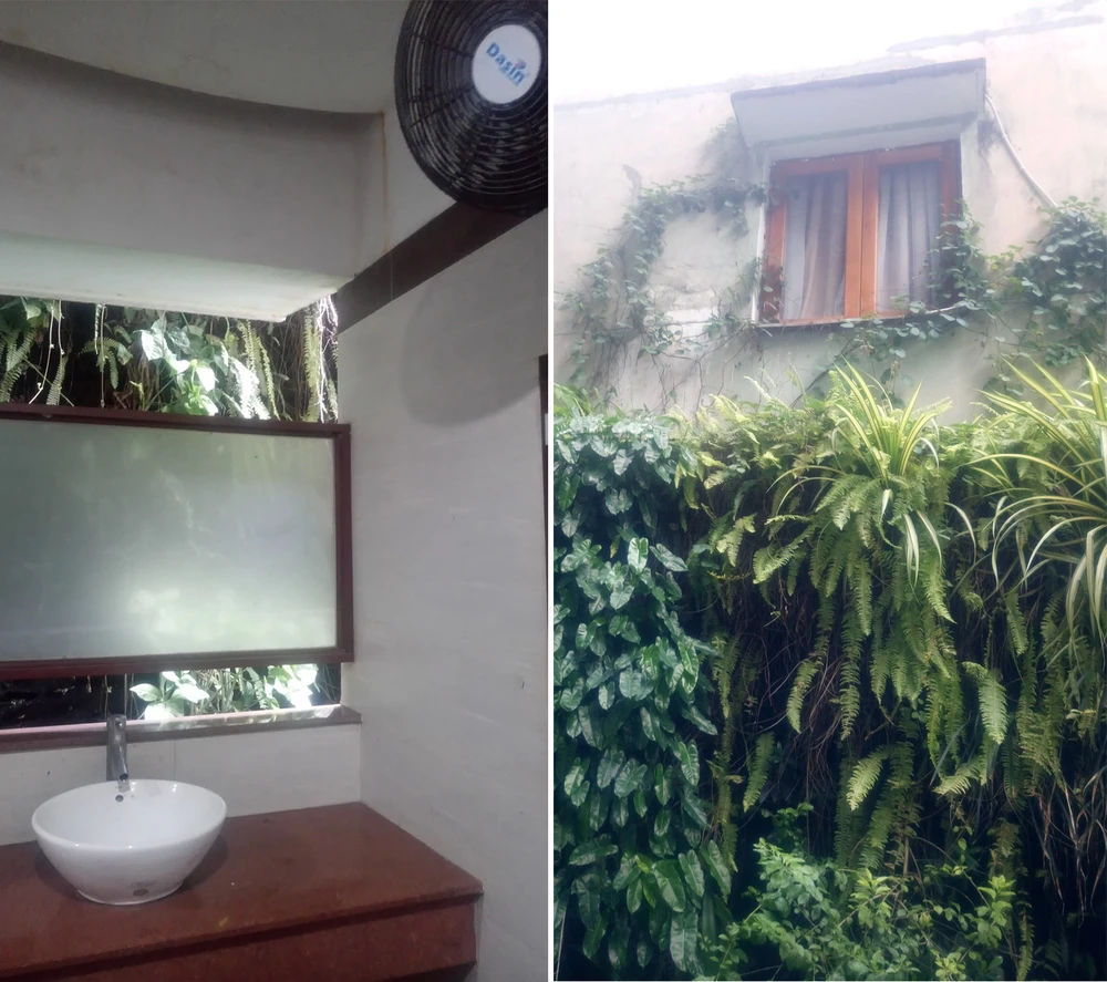 Ảnh trái: Nhà vệ sinh thoát mát, sạch sẽ, thấp thoáng bóng cây thay cho cái hộp bít bùng bốc mùi nồng nặc ngày trước. Ảnh phải: Ngay cả những bức tường khô cứng cũng được ‘mềm hóa’ bằng những hàng dây leo, cây tiểu cảnh vườn tường đứng. Ảnh: HỒ TRANG