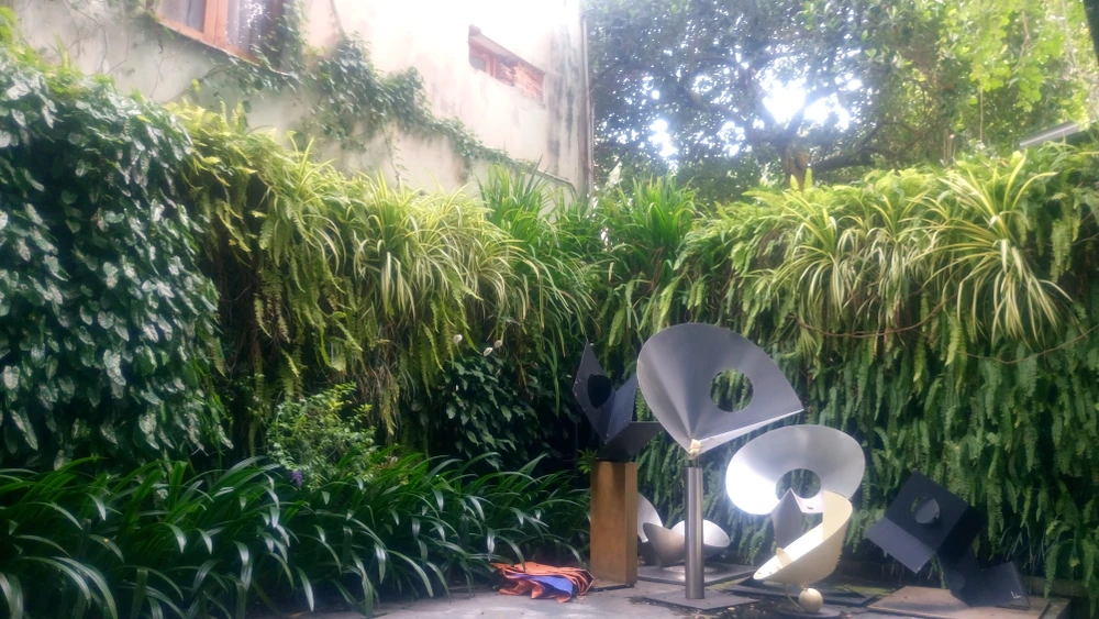 Hàng rào cây quanh tường như khu rừng rậm rạp tạo cảm giác bình yên, thư thái giữa phố thị ồn ào đầy xe cộ, khói bụi. Ảnh: HỒ TRANG