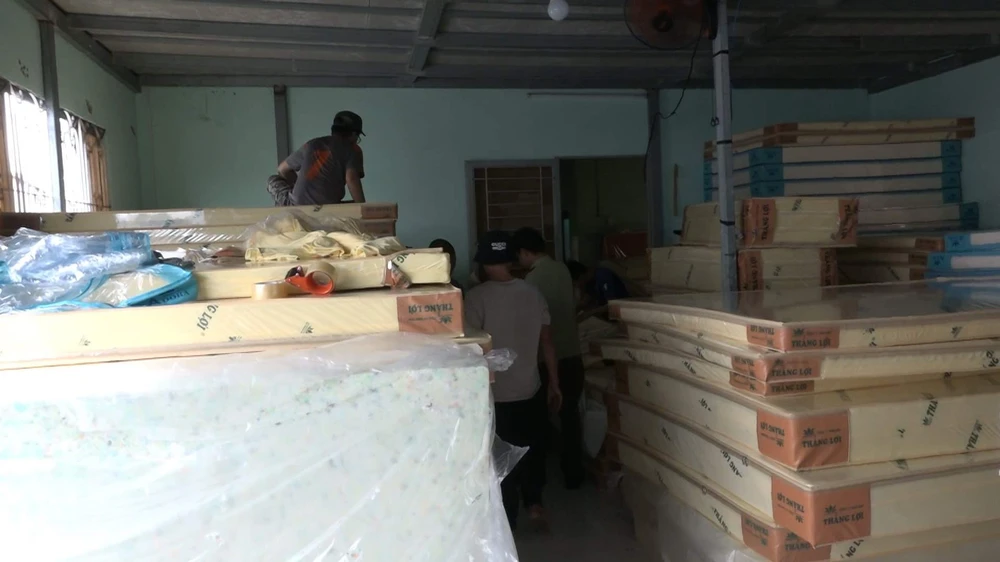 Tại thời điểm kiểm tra, lực lượng chức năng phát hiện nhiều công nhân đang sản xuất nệm có dấu hiệu nghi giả mạo thương hiệu Thắng Lợi. Số nệm này được kết dính bằng múp xốp không phải cao su.