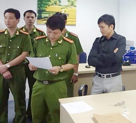 Công an đang đọc lệnh khám xét trụ sở Công ty Thiên Việt ở TP.HCM và lấy lời khai những người liên quan. Ảnh: BÙI TƯ