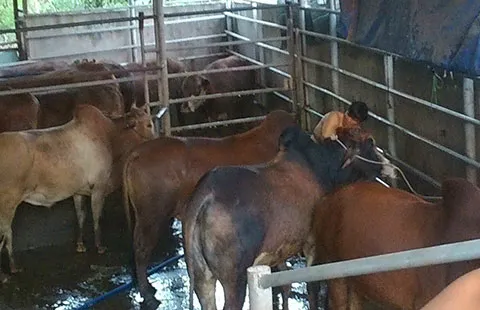 Đến giờ bơm nước, lái bò tên Đục lần lượt buộc năm con bò vào tường rào cạnh hai vòi nước. Sau đó, Đục lấy một ống nước nhựa dài khoảng 1,5 m màu xanh, to bằng cổ tay ra chỗ bò đang buộc rồi xả van nước. Với biệt danh “sát thủ” bơm nước nhanh và gọn, Đục kéo dây xỏ mũi bò vắt lên tường rào cho đầu bò ngẩng, miệng há. Không tốn chút sức nào, Đục thọc ống nước đang chảy xối xả vào họng bò. Lúc này con bò lắc mạnh đầu vùng vẫy nhưng dây buộc chặt, nó đành bất lực, đứng yên chịu trận.