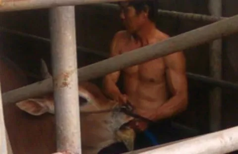 Hình như việc bơm nước bò ọc máu là chuyện bình thường nên người đàn ông không chút chùn tay, tiếp tục thọc ống nước vào bò kế bên. Tuy nhiên, con bò này nhỏ và yếu hơn nên khi bị bơm nước, bò không chịu nổi lập tức ọc nước, ngã quỵ. Thấy vậy chủ lò mổ lên tiếng: “Con này non, yếu nên bơm ít thôi, không chết bây giờ”. Người bơm dừng tay, bò liêu xiêu đứng dậy dựa vào bức tường. Hơn một phút sau, con bò này thải ra màu nước đỏ au...
