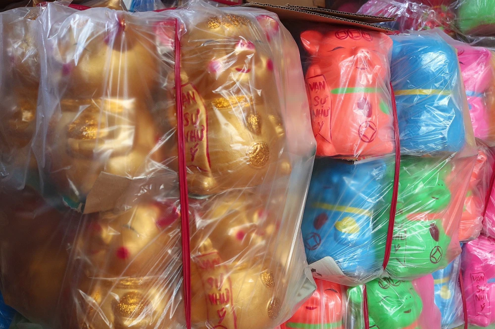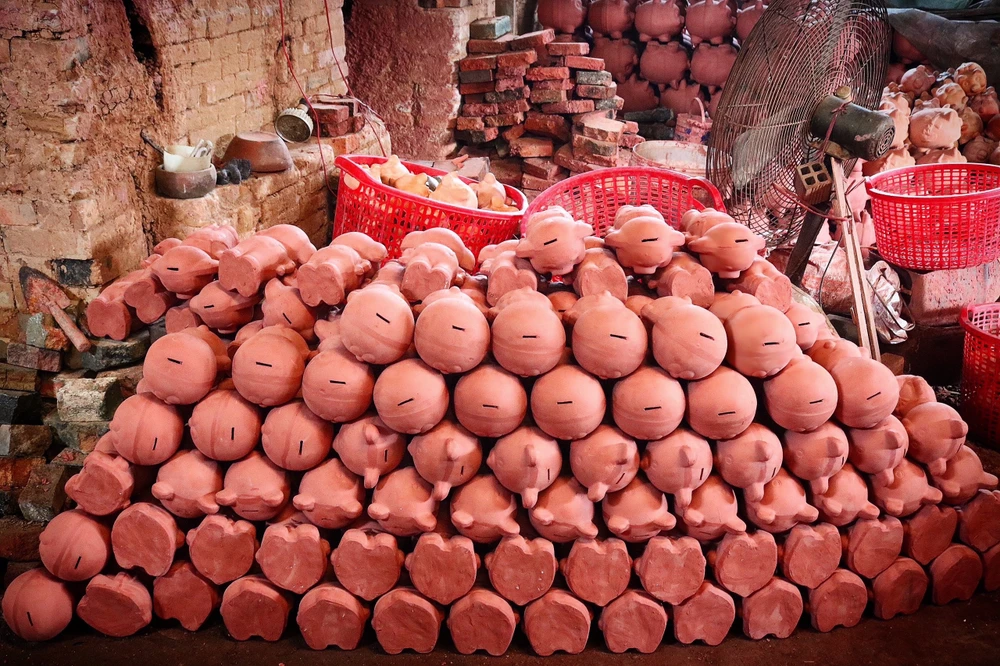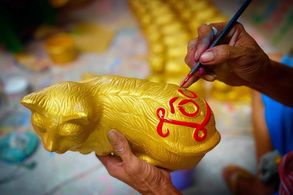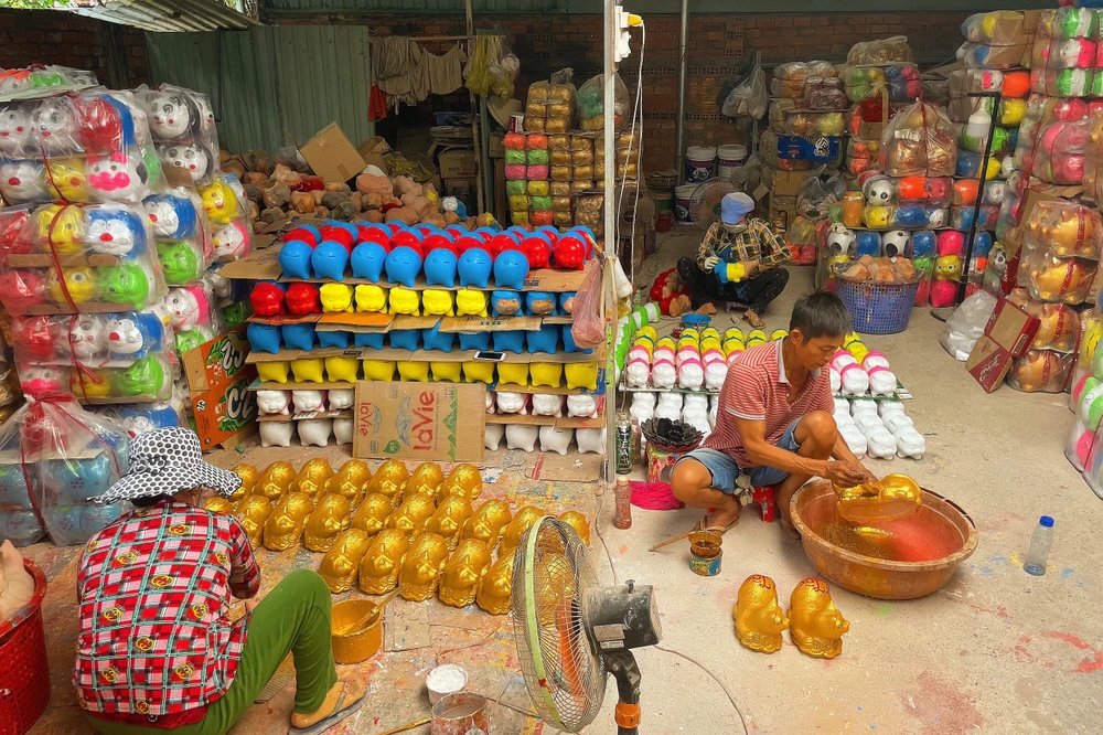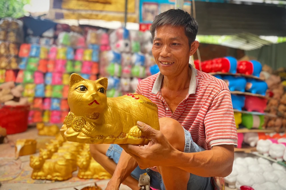 Cách đó vài trăm mét, nhà xưởng của anh Trịnh Quốc Khanh cũng đang tất bật gia công và sơn mèo, anh Khanh cho biết, mỗi ngày anh hoàn thiện khoảng 1000 sản phẩm từ mèo vàng đến heo đất, đa dạng mẫu mã.
