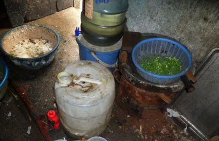Nơi chế biến đồ ăn thức uống cực kỳ bẩn thỉu: các dụng cụ dùng để chặt, thái, đựng thức ăn cáu bẩn đáng ngại.