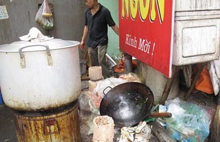 Chúng tôi chọn một bàn ăn phía góc cuối quán, ở vị trí đó chúng tôi có thể quan sát được hết các đồ dùng nấu ăn, bếp nấu ăn và cả những chén đũa sau khi khách ăn xong. Bàn ăn bằng inox trắng nhưng đã không còn giữ được màu của nó, thay vào đó là một màu đã ngả ố, hoen vàng. Đầu ngón tay tôi quệt xuống mặt bàn tạo ra một đường sóng những chất nhơn nhớt. Tôi cảm thấy rợn người và… hết muốn đói luôn. Ăn được vài miếng, tôi đi về phía sau và giả bộ hỏi chỗ đi rửa tay. Hình ảnh khủng khiếp đã hiện ra trước mắt tôi: chén đĩa ăn xong được chất đống ngay bên cạnh bồn cầu, trên nền xi măng đã tróc vì xây dựng lâu ngày. Thức ăn dư, nước mỡ, mắm tôm sống… tạo thành một mùi hỗn hợp hết sức khó chịu, suýt chút nữa tôi ói nếu không cố kìm lại.