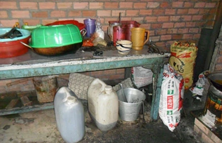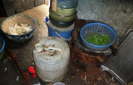 Những lớp muội than (đun than tổ ong) bám thành lớp dày trên các xoong nồi, chảo, thậm chí cả trên những cánh quạt treo tường cũng có một lớp bụi đen bám dày hàng centimet, trần nhựa đã vàng khè vì thời gian với lớp than bụi bám vào tạo cho chúng tôi cảm giác nó sẽ rơi bất cứ khi nào kể cả đang ăn. Quan sát kỹ, chúng tôi thấy những can dầu ăn đen ngòm, dường như nó đã được sử dụng đi sử dụng lại rất nhiều lần. Không tem, mác của hãng nào sản xuất cả.