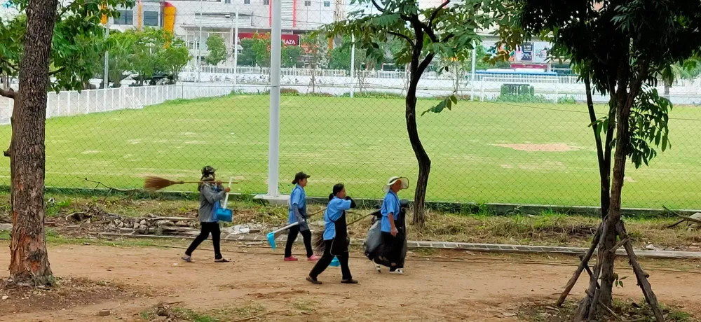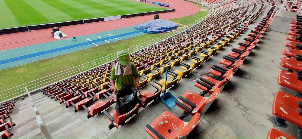 Công nhân đang dọn dẹp sạch sẽ khu vực khán đài một ngày trước khi trận đấu hấp dẫn Thái Lan - Việt Nam diễn ra lúc 19 giờ ngày 5-9.