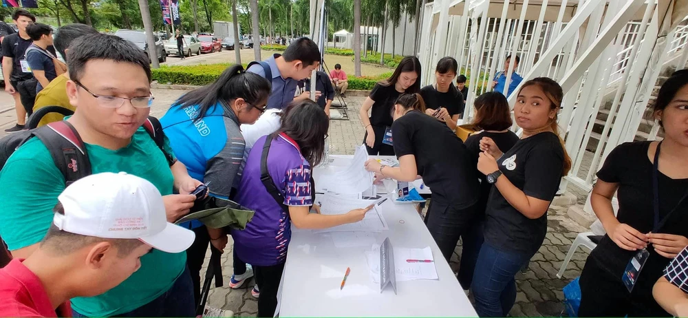 Ban tổ chức chủ nhà Thái Lan tiến hành cấp phát thẻ cho các phóng viên hai nước tác nghiệp bên ngoài sân vận động.