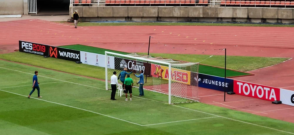 Ban tổ chức sân Thammasat kiểm tra kỹ lưỡng cầu môn chuẩn bị cho trận đại chiến Thái Lan - Việt Nam. Ảnh: ANH PHƯƠNG