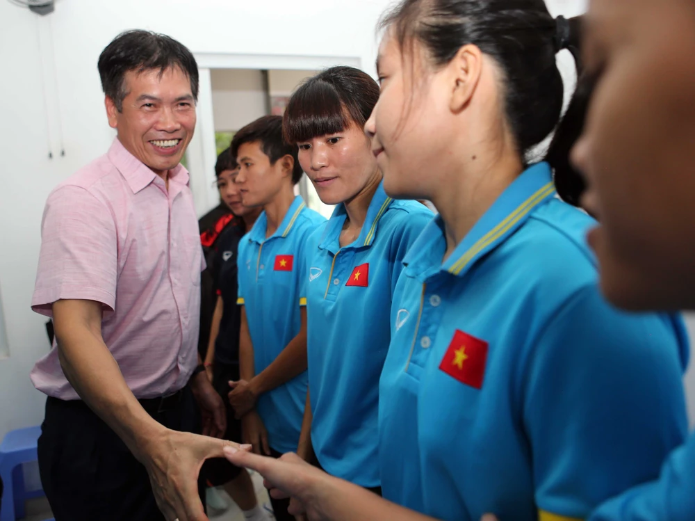 Ông Trần Đức Phấn bắt tay các nữ tuyển thủ Futsal