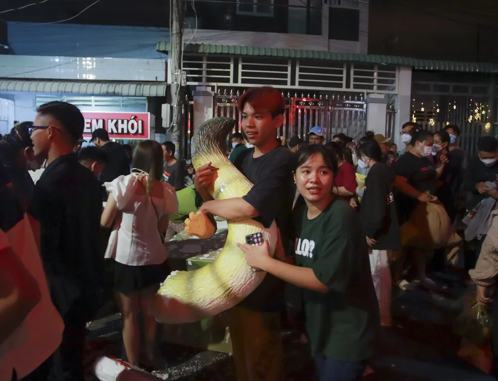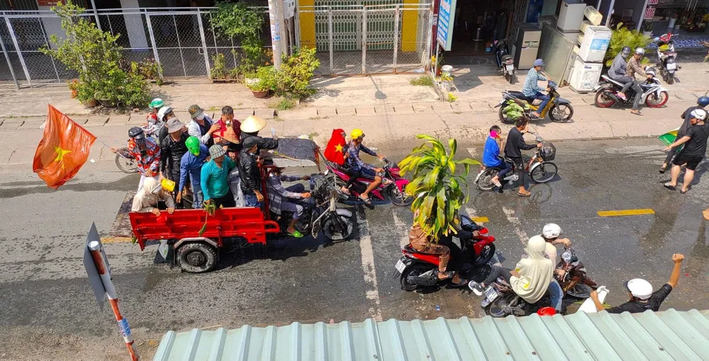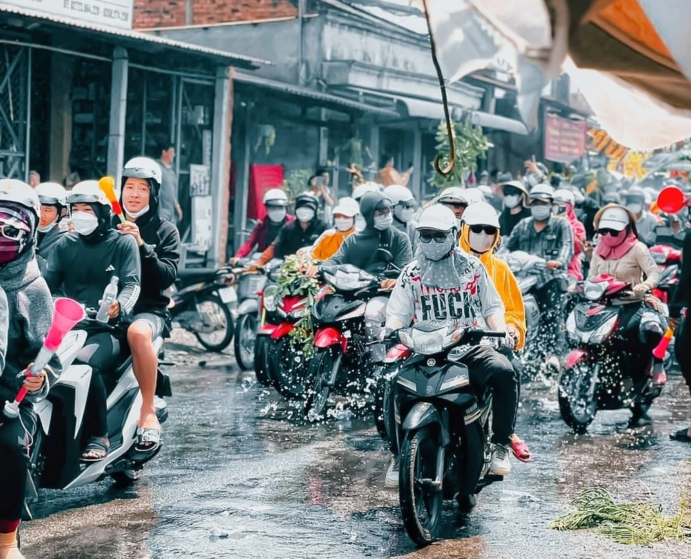 | Trong ngày lễ hội, dọc các con đường, nhiều thanh niên dùng vòi xịt, thau, xô tát nước những người đi đường. |