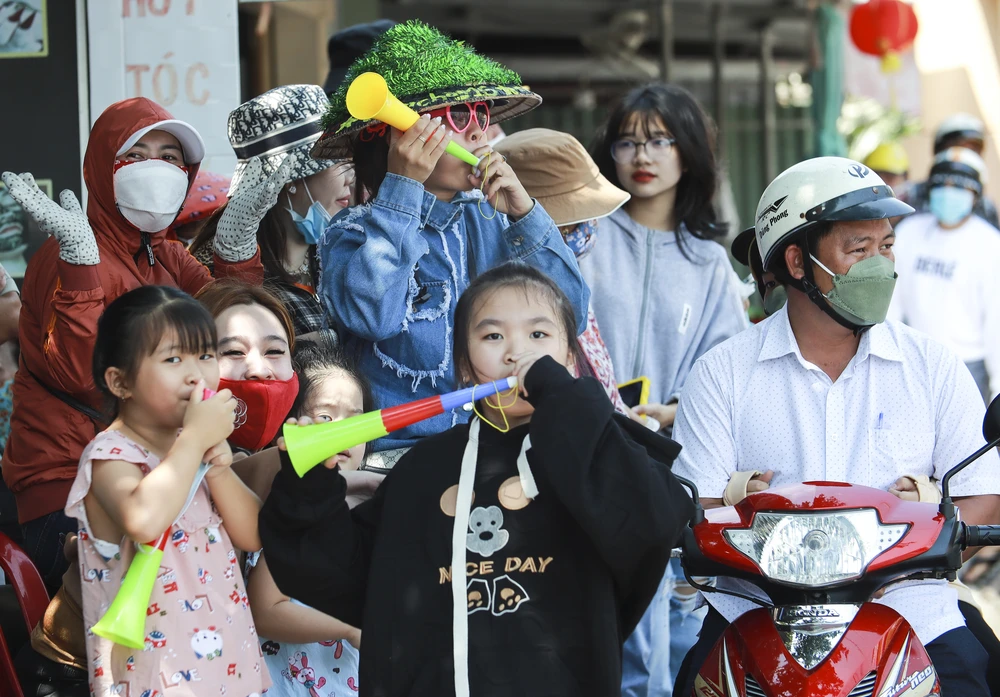 Rất đông người dân ra đường theo đoàn Chiêu u với cờ hoa, kèn tham gia lễ hội |