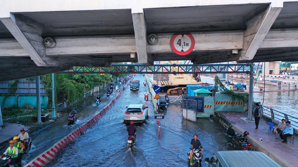 Nhà thầu dừng bơm nước khu vực công trình thi công cống Phú Định, phường 7 (quận 8) khiến triều cường dâng cao trên nhiều tuyến đường ngày