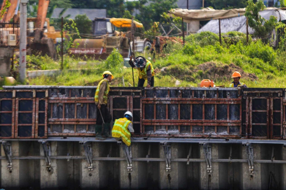Các công nhân đang tích cực làm việc tại công trường dự án. Ảnh NGUYỄN CHÂU |