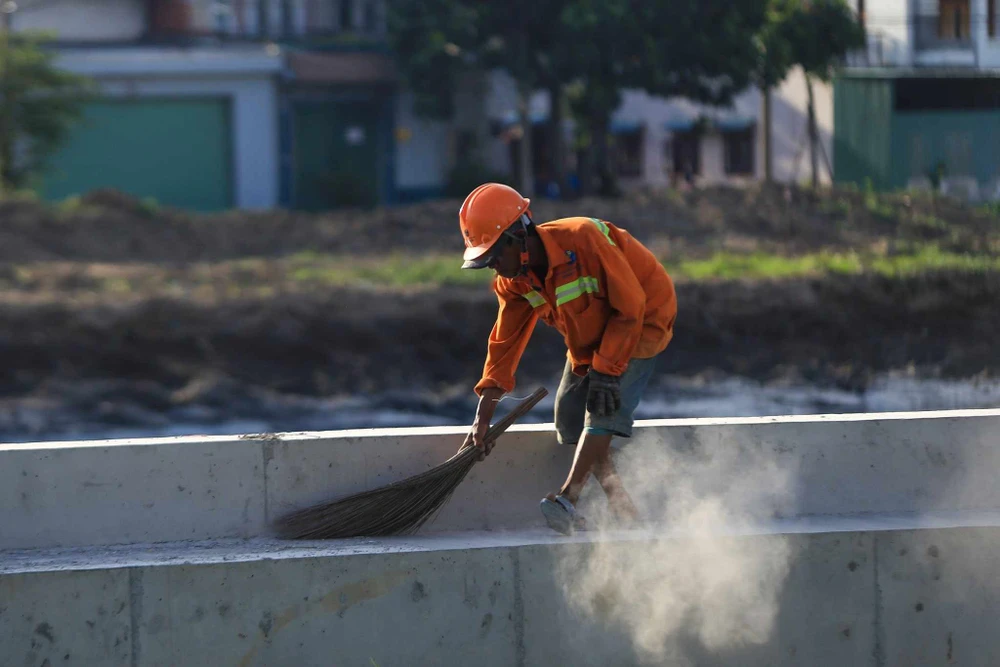Công nhân cẩn thận thực hiện từng hạng mục của dự án. Ảnh: NGUYỄN CHÂU |