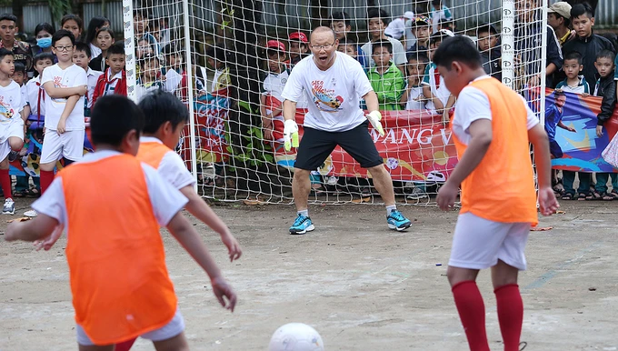 HLV Park Hang-seo làm thủ môn trong một chuyến đi thực hiện dự án “Gieo mơ ước - Give a dream”. Ảnh: CTV