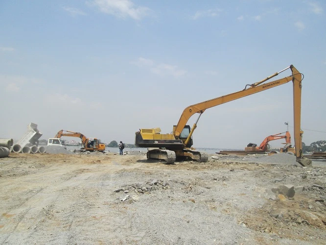 Xe xúc, xe ủi đang khẩn trương san lấp