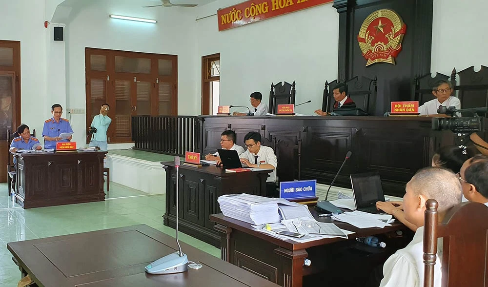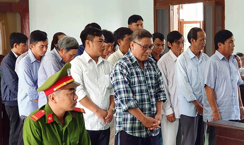 16 bị cáo nghe đại diện VKSND tỉnh Phú Yên công bố cáo trạng. Ảnh: TẤN LỘC