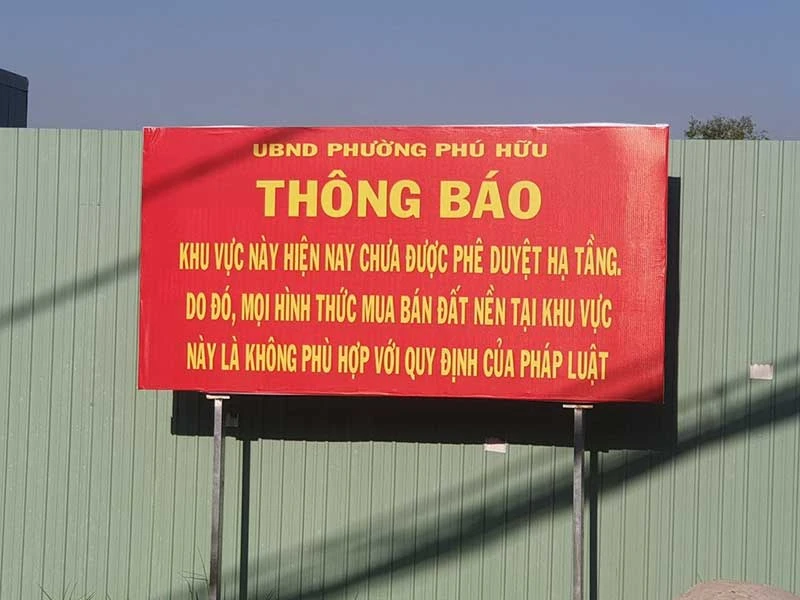 Để tránh nguy cơ có thêm người dân bị thiệt hại, mới đây UBND phường Phú Hữu đã gắn bảng thông báo cụ thể về tình trạng pháp lý của khu đất này.