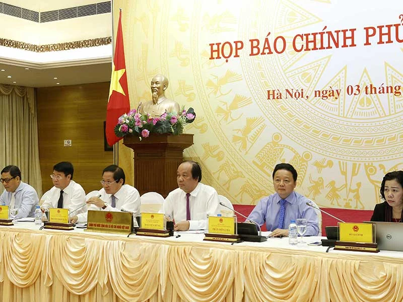 Quang cảnh buổi họp báo Chính phủ thường kỳ tháng 7-2017. Ảnh: TTXVN