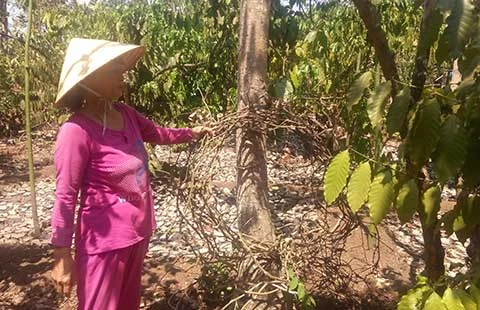 Tiêu, cà phê của bà Lê Thị The chết dần chết mòn vì thiếu nước trong khi vườn cách hồ chỉ khoảng 100 m. Ảnh: TIẾN DŨNG
