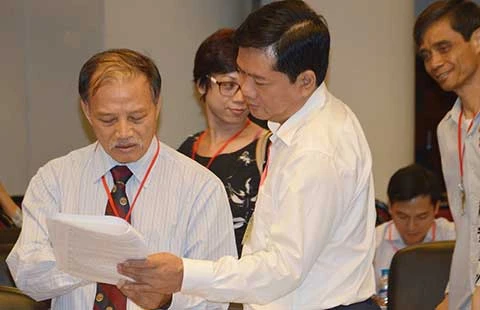 Bộ trưởng Thăng trao đổi với PGS-TS Nguyễn Thiện Tống (bìa trái), người phản biện quyết liệt dự án Long Thành. Ảnh: N.NHÂN